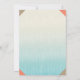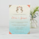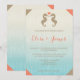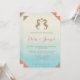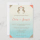 Convite de casamento com tema tropical com duas cavalinhas-marinhas castanhas-arenosas de frente uma para a outra com um coração em cor rosa coral entre elas. A cor do fundo é um gradiente de azul claro a branco com algumas listras leves nele. Como detalhe extra, cada canto deste convite tem uma cor bege ou rosa coral.