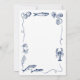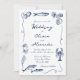 Este convite de casamento costeiro desenhado à mão em branco e azul naval é perfeito para a estética de pescador em alta, e apresenta uma moldura de desenho caprichoso com conchas desenhadas à mão, peixes e vida marinha.