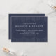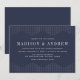 Convite de casamento elegante e moderno com os seus nomes e detalhes do casamento em letras brancas bordeadas por um desenho geométrico pontilhado. O fundo azul-marinho pode ser alterado para uma cor à sua escolha.