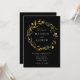 Convites de casamento de flores silvestres elegantes, com seus nomes exibidos em letras verdes cercados por uma coroa de folhagem verde e flores em tons de ouro amarelo, rosa e roxo com fundo preto. Personalize os convites de casamento floral de verão com seus detalhes de casamento abaixo. os convites de flor silvestre de aquarela são perfeitos para casamentos de primavera e verão.