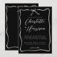 Um simples guião manuscrito moderna e minimalista tipografia branca no convite de casamento preto, enquadrado com uma fita ondulada com arco em estilo desenhado à mão. Estilo informal de coquete branco. Disponível em impressão, como download digital ou ambos.