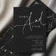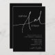 Apresentando um convite encantador de casamento que harmoniza elegância do eterno com o refinamento contemporâneo. Os nomes dos casais ocupam o palco central em uma fonte sofisticada e clássica de serifa, exuando um ar de graça e tradição. A riqueza do negro fornece um pano de fundo de formalidade e sofisticação. Numa delicada caligrafia moderna, a palavra "E" tece seu caminho através do convite, como uma promessa sussurrada entre dois corações. Este toque sutil acrescenta um florescimento contemporâneo ao tradicional, simbolizando a união que esta ocasião celebra. A escolha da cor preta dá ao convite um sentido de profundidade e gravita, elevando toda a composição a um nível de opulência refinada. Contra este pano de fundo dramático, os nomes dos casais brilham com um charme digno, enquanto a delicada caligrafia de "E" suaviza a aparência geral, criando um equilíbrio perfeito de elementos. Como um todo, este convite pinta um quadro de um amor que liga o passado e o futuro. O contraste entre fontes serif e caligráficas captura a essência de um casal embarcando em uma jornada juntos, fundindo suas histórias individuais em uma narrativa compartilhada. É um convite que promete um evento marcado pela sofisticação, conexão e celebração do amor eterno.