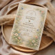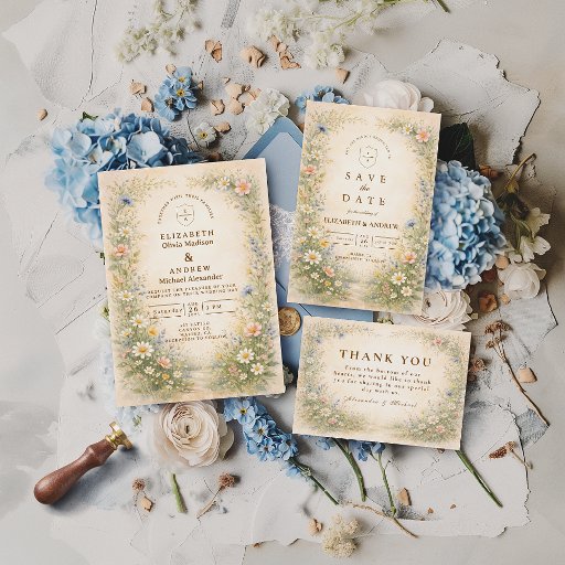 Um prado romântico de delicadas florações em aquarela emerge da base deste elegante design, apresentando cosmos rosados, margaridas delicadas, flores amarelas como manteiga e flores silvestres azuis etéreas. O fundo quente de pergaminho e a tipografia refinada em dourado criam uma estética atemporal e ensolarada que parece ao mesmo tempo rústica e sofisticada. Leve, arejada e lindamente equilibrada, esta criação captura o charme de uma celebração no campo com um polimento clássico. Perfeita para casais que amam o romance de jardim com um acabamento refinado.