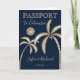 Convite de Casamento no Destino México Mapa Mundial Moderno e Elegante, como passaporte. Palmeiras douradas desenhadas à mão na página inicial, localização Cartagena, Colômbia