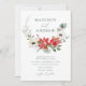 Convites de casamento com tema de inverno com seus nomes exibidos sobre poinsettias de aquarela, flores brancas, bagas ocas, pinecones e folhagem verde. Os convites de casamento de poinsettia invertem para mostrar um fundo verde escuro sólido. Os convites de casamento botânicos são perfeitos para o seu casamento no inverno ou no Natal.