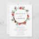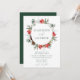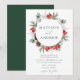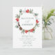 Convites de casamento com tema de inverno com seus nomes cercados por uma coroa de poinsettias de aquarelas, flores brancas, bagas ocas, pinecones e folhagem verde. Os convites de casamento de poinsettia invertem para mostrar um fundo verde escuro sólido. Os convites de casamento botânicos são perfeitos para o seu casamento no inverno ou no Natal.