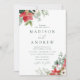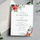 Convite para casamento temático de inverno com detalhes de seu casamento exibidos em letras verdes escuras com buquês de poinsettias de aquarela, flores brancas, bagas ocas e folhagem verde nos cantos. Os convites de casamento de poinsettia invertem para mostrar um fundo verde escuro sólido. Os convites de casamento botânicos são perfeitos para o seu casamento no inverno ou no Natal.
