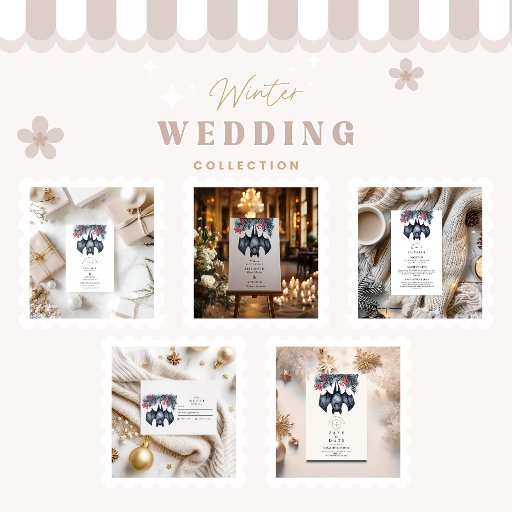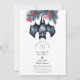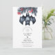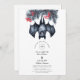 Uma ilustração gótica arrojada com um morcego de aquarela pendurado de cabeça para baixo do pinheiro de inverno com bagas vermelhas. Esta design sombria, ainda brincalhona, combina a escuridão com espírito de feriado — perfeita para casamentos no inverno alternativos ou góticos com senso de humor e borda.