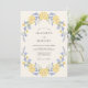 Este design apresenta um arranjo delicado de rosas amarelas ensolaradas e campainhas azuis suaves. O estilo de arte aquarela cria um clima romântico e sereno perfeito para um evento de primavera. Toques de folhagem verde-sage complementam os tons florais quentes contra um fundo neutro creme.
