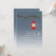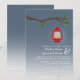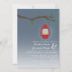 Um convite de casamento ao ar livre à noite com uma ilustração de uma lanterna de óleo vermelha pendurada num galho de árvore com folhas verdes. Personalize o texto com suas informações.