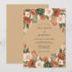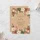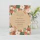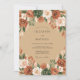 Uma paleta de cores quentes de rosas em aquarela em ferrugem e creme cria uma exibição botânica exuberante neste design. Os tons terrosos são complementados por eucalipto verde floresta e delicados caules de folhas contra um fundo bege natural. Esta obra de arte floral captura um clima orgânico e sofisticado perfeito para um tema de colheita ou floresta.