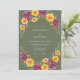 Este design apresenta um fundo verde oliva profundo adornado com flores vibrantes em aquarela. Dahlias de ameixa rica e zínias amarelas douradas criam um contraste ousado e quente perfeito para um evento de outono. Ramalhetes delicados de folhagens e pequenas bagas vermelhas adicionam um toque de charme silvestre. O clima é sofisticado e terroso, capturando uma atmosfera de colheita rústica.