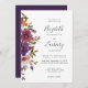 A borda esquerda deste convite romântico de casamento apresenta um buquê floral de cor d'água de flores roxas, roxas, pincéis e cobre e verde. O texto personalizável combina manuscrito, copperplate e fontes itálicas em cinzas de carvão em um fundo branco. O reverso é um roxo sólido coordenado. Ideal para um casamento outono!