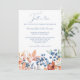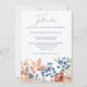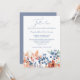 Este convite romântico de casamento apresenta um tema floral de outono em tons azuis, beges e de cobre. As flores, bagas e folhagem do outono, ao estilo aquoso, são colocadas ao longo da parte inferior para se assemelharem a um jardim selvagem. Pequenas bagas azuis são enfeitadas com flores coloridas de cobre e folhas coloridas de ferrugem.