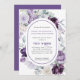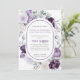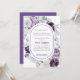 Este convite de casamento exude elegância romântica com um motif floral de cor aquosa. Um arranjo exuberante de flores roxas, brancas e verdes — com rosas e peônias — enquadra o design em uma borda oval suave. Os florais são delicadamente pintados, dando à peça uma sensação sonhadora e inspirada no jardim. A área central do texto é limpa e equilibrada, fechada por um sutil contorno roxo que complementa a paleta ao redor. No geral, o convite combina encanto clássico com beleza botânica, perfeito para vinhedo ou celebração ao ar livre.