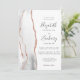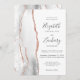 A borda esquerda deste elegante convite de casamento moderno apresenta uma cinza e uma aquarela branca, aparada com falso brilho de rosa. O texto personalizável combina manuscrito, copperplate e fontes itálicas em cinzas de carvão em um fundo branco. O verso apresenta uma cinza correspondente, design branco e rosa dourado.