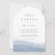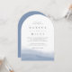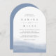 O convite de casamento costeiro elegante apresenta gradientes de cor azul clara ao longo do fundo, com uma curva graciosa que evoca a borda e o fluxo do mar. Seus detalhes de casamento aparecem em cinzas clássicas minimalistas com nomes ousados.