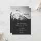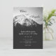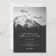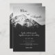 Casamento preto e branco debaixo das montanhas. Fotografia paisagística de uma montanha coberta de neve com escuridão abaixo e céu branco nublado acima. Os nomes do casal estão em caracteres pretos acima da montanha no céu e todos os detalhes estão em caracteres brancos abaixo da montanha. Produtos de casamento totalmente personalizáveis e personalizáveis.