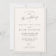 Esse delicado, íntimo, convite apresenta uma combinação de tipografia clássica e moderna e os menores embelezamentos de duas galerias graciosamente arqueadas de aquarela verde-sábio, apontando, romanticamente, a simetria de duas vidas se tornando uma só. A caligrafia encantadora acentua o casamento, o registro e também a palavra "e" que aparece entre os nomes da noiva e do noivo. O fundo é uma cor maravilhosamente quente e atraente naturalmente, que lembra o antigo pergaminho de linho de ontem. A fronteira está fracamente enfiada para guiar suavemente o olho em direção ao texto. Este convite completo tem um marcador no verso para todos os detalhes do seu casamento e, abaixo, espaço para um código QR que, uma vez digitalizado, irá transportar o seu convidado para o seu site de casamento pessoal onde poderá RSVP, perusar o registro, deixar uma mensagem e participar plenamente no entusiasmo de atualizações, à medida que a contagem regressiva começar no dia especial.