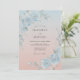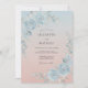 Esta obra de arte apresenta um fundo ombre suave que transita de um azul celeste fresco para um rosa pêssego quente. Rosas elegantes em aquarela em tons de azul desbotado adornam os cantos, acompanhadas por folhagens verdes delicadas. A estética é etérea e romântica, perfeita para um evento sazonal caprichoso. Uma paleta de tons pastéis cria uma atmosfera serena e polida.