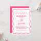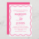 Este Convite para Casamento Retro-Cor-de-Cor-de-Cor-de-Cor-de-Cor-de-Cor-de-Rosa-Vaga mistura tons rosas e vermelhos vibrantes com curvas e pretos lúdicos para uma única e retrorativa vibração de casamento. A design contemporânea apresenta caligrafia na moda, dando uma nova, mas nostálgica reviravolta aos convites tradicionais de casamento. Perfeito para casais que querem um convite de casamento ousado e ondulado que se destaca com seu talento moderno e encanto retrô.