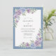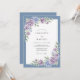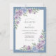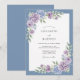 Flores delicadas em tons de lavanda e roxo suave cascateiam sobre um fundo azul suave. Este design evoca um clima terno e romântico com seus arranjos florais suaves. A paleta de cores cria uma atmosfera serena e sofisticada para uma ocasião especial.