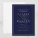 Convite de casamento romântico apresenta grafia estilosa e detalhes do evento em fonte elegante em dourado, azul-marinho e branco, moderno e simples, ótimo para casamento formal minimalista, casamento clássico tradicional, casamento simples moderno. Veja todas as peças correspondentes na coleção abaixo.