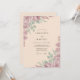 Este design apresenta um fundo suave de pêssego adornado com flores delicadas em aquarela. Rosas malva suaves e ramalhetes de verde criam uma estética romântica e inspirada no vintage. Folhas elegantes de eucalipto e pequenos detalhes botânicos proporcionam um toque natural e arejado. Esta paleta é perfeita para um evento clássico de primavera ou verão.