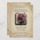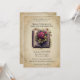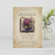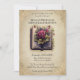 Este convite romântico de casamento apresenta um tema de conto de fadas antigo. Uma imagem de um velho livro de histórias é ilustrada no centro, acentuada com rosas vermelhas. O plano de fundo apresenta um padrão esmaecido de papel pergaminho. Um quadro dourado do estilo vintage borda o convite. Os nomes do casal são impressos por cima do livro. A localização e os detalhes do casamento de conto de fadas são impressos abaixo em uma letra elegante.