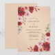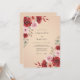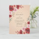 Uma rica paleta de borgonha profundo e rosa suave define este romântico design floral em aquarela. Flores de rosa exuberantes e raminhos de folhas de eucalipto criam um visual botânico sofisticado e atemporal contra um fundo de champanhe quente. Esta estética elegante captura a essência da beleza sazonal, tornando-a ideal para um evento de casamento clássico.