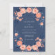 Este design apresenta um fundo azul-marinho profundo combinado com um arranjo vibrante de rosas pêssego e coral. A folhagem azul escura cria uma estética botânica sofisticada e sombria adequada para cerimônias de inverno ou formais. Detalhes suaves em aquarela e elementos florais em flor fornecem um visual romântico e atemporal. A paleta rica e os acentos florais evocam uma atmosfera de elegância.