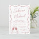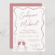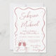 Um convite de casamento feito à mão, com ondas e um copo de champanhe. Ajuste os nomes e o sinal "+" para obter o melhor ajustado.