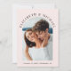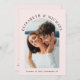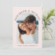 Convite de casamento rosa moderno que mostra sua foto em um quadro de arco cercado por seus nomes em tipografia elegante e data e local de casamento. No verso, personalize seu convite em uma simples tipografia e insira seu endereço no site do casamento para criar um código de QR digitalizável para seus convidados digitalizarem para RSVP on-line e obter detalhes adicionais de casamento, como instruções e acomodações.