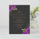 Este romântico convite para o casamento floral apresenta buquês florais roxos saltados com folhas de folha de alumínio em dois cantos. Os nomes do casal aparecem em fontes clássicas de serifa dourada, com o texto restante em itálico, em fundo preto de ardósia escura. O verso fornece espaço para detalhes do casamento em um fundo escuro sólido, junto com um código QR que os convidados podem digitalizar para visitar seu site e RSVP, o que economiza o custo de imprimir e enviar cartões RSVP separados.