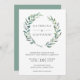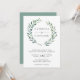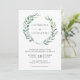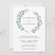 Convite para casamento elegante e rústico com seus nomes dentro de uma coroa verde pintada com aquarela. Estes convites de casamento botânico modernos são perfeitos para um casamento de verão.