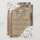 Design de convite de casamento da Rússia Ocidental com rendas brancas sobre fundo de linen e tábuas de madeira envelhecidas.