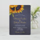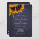 Elegante verão chic ou modelo de na moda de convite para casamento outono na noite escura do quadro azul marinho apresentando um belo buquê de girassóis e um roteiro de caligrafia em ouro branco e falso. ++++++++++++++++++++++ O convite é adequado para casamentos elegantes de Verão ou outono no país russo.