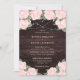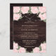 Complemente sua festa de casamento rustica rosa-pincelada com este elegante convite para casamento floral com rosas rosa-pinceladas e hálito de bebê em um fundo de madeira de celeiro decorado com luzes de cordas. Itens correspondentes disponíveis.