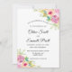Flores silvestres coloridas decoram este convite de casamento Bô Chic. Flores amarelas, cor-de-rosa e roxas são aninhadas em folhas e folhagem.