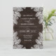 Este convite de casamento elegante e vintage é perfeito para um evento clássico. Apresenta uma rendas brancas desenhadas à mão sobre um fundo de madeira marrom rústico. É o sul, bonito, doce, moderno e único; o design perfeito para impressionar seus convidados. ***NOTA DE DESIGN IMPORTANTE: Para qualquer solicitação de design personalizada, como solicitações de correspondência de produtos, alterações de cor, mudanças de posicionamento ou qualquer outra solicitação de alteração, envie uma mensagem ao designer. Você pode até enviar a ela um pedido de uma design completamente personalizada e nova.