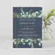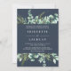 Chic e elegante convite de casamento botânico de eucalipto. Enquadre seus detalhes do dia do casamento com folhas de eucalipto em verde e folhagem azul com fundo azul da meia-noite e na moda branco. Personalize facilmente este modelo de convite com os detalhes do dia do casamento.