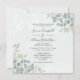 Elegante eucalipto e verde elogioso aparecem nesta design romântica. Com uma paleta colorida azul, verde e azul suave/cinza empoeirada, este tema é perfeito para o seu casamento. O fundo tem uma textura aquosa em verde-sábio. Fácil de personalizar com seus detalhes exclusivos.