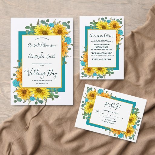 Este belo, moderno e rústico design apresenta buquês exuberantes de girassóis, rosas verdes azuis e verde incluindo folhas de eucalipto e samambaias. Atrás dos buquês há um retângulo de turquesa aqua-preto-escuro, e na frente há uma área branca de borda-dourada com o texto personalizável em negros em tenda, roteiro elegante e tipografia sans serif. A parte de trás está combinando. Você pode personalizar este item para seu evento especial alterando o texto no modelo do produto.
