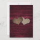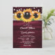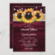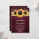 Um convite para o casamento de burgôs rústicos e girassóis, com flores de sol amarelas e luzes de cordas contra um fundo de madeira de burgundy adornado com burlap and lace. Dois corações de burlap nas costas.