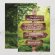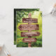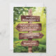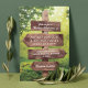 Convites de casamento botânicos caprichosos com um cenário romântico e mágico da floresta, luzes de corda e as informações do seu casamento escritas em um poste de madeira rústico.