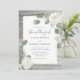 Convites de casamento florais rústicos em branco e dourado que você pode personalizar facilmente em um belo modelo DIY fácil de usar. O design original boêmio aquarelado ilustrado por Raphaela Wilson retrata rosas brancas elegantes acentuadas em dourado sobre folhas de eucalipto prata-dólar em tom sage verde. Abaixo destas flores há uma madeira de celeiro vintage em tons claros e escuros de azul-cinza empoeirado. Ao personalizar ainda mais o design, você pode revelar camadas ocultas que têm diferentes cores de madeira de fazenda em tons de azul-marinho, branco-marfim, burgundy vermelho, roxo lavanda, marrom quente e azul-esverdeado. Nesses convites de casamento elegantes, você também tem a flexibilidade criativa de esconder a madeira completamente e escolher entre um design de lavagem aquarelada cinza ou uma cor de fundo simples e única de sua escolha. Prefere acentos prateados em vez de dourados para sua folhagem de eucalipto? Basta ocultar as camadas douradas e revelar as folhas e galhos prateados! Esses belos convites de casamento de rosa branca complementam qualquer celebração de casamento/chá de noiva com tema de jardim ao longo do ano - seja outono, verão, primavera ou inverno. Categoria: convites de casamento rústicos; conv