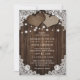 Convites de casamento de países rústicos personalizados com dois corações de burlap em um fundo de madeira rústica adornados com rendas florais brancas e luzes de cordas. Personalize facilmente esses cartões de casamento rústicos para seu país rústico, ou festa de casamento de celeiro.