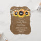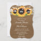 Convite de casamento russo para girassol apresentando flores de girassol contra uma burlap e fundo de renda adornados com luzes de cordas.