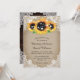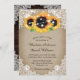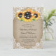 Convites de casamento de girassol rústico elegantes ideais para um país rústico, quintal, jardim ou festa de casamento de celeiro inspirados em flores de girassol. Itens de correspondência disponíveis para complementar estes convites de casamento rústicos com girassóis em um fundo de burlap adornado com rendas florais brancas e luzes de cordas. Madeira de celeiro e renda na parte de trás do cartão.