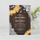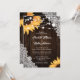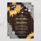 Este elegante convite floral para o casamento, que inclui girassóis contra um fundo de madeira de celeiro adornado com rendas florais brancas e luzes de cordas é perfeito para convidar seus convidados para seu país rústico/quintal/festa de casamento de celeiro inspirado pelos girassóis. Fácil de personalizar a modelo. design personalizável a 100%.